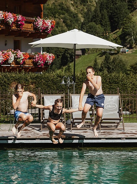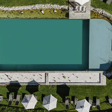 Was gibt es Schöneres, als sich an einem warmen Sommernachmittag im angenehm temperierten Pool abzukühlen? Unser Naturpool, der ganz ohne chemische Zusätze auskommt, bietet in den warmen Monaten Spaß und Entspannung für Jung und Alt. Die großzügige Wiese mit Liegen und Schirmen ist perfekt zum Chillen, Sonnenliegen und Seele baumeln lassen.
