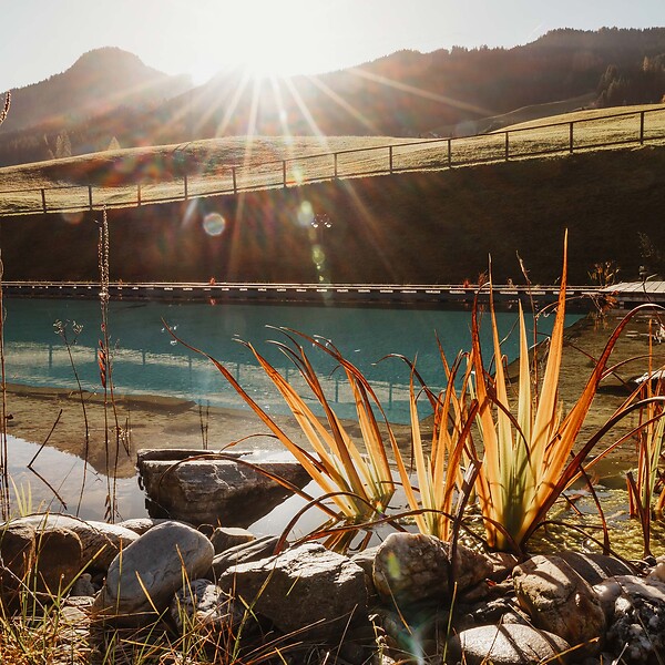 Our wellness world is growing! From July 2026, in addition to our natural pool, we offer a new outdoor pool heated to a comfortably warm 32 °C all year round. With its indoor access, swimming becomes wonderfully convenient in every season and in any weather. From the steaming water, you can admire the mountains and meadows of Großarl — whether in lush green or covered in glistening snow.